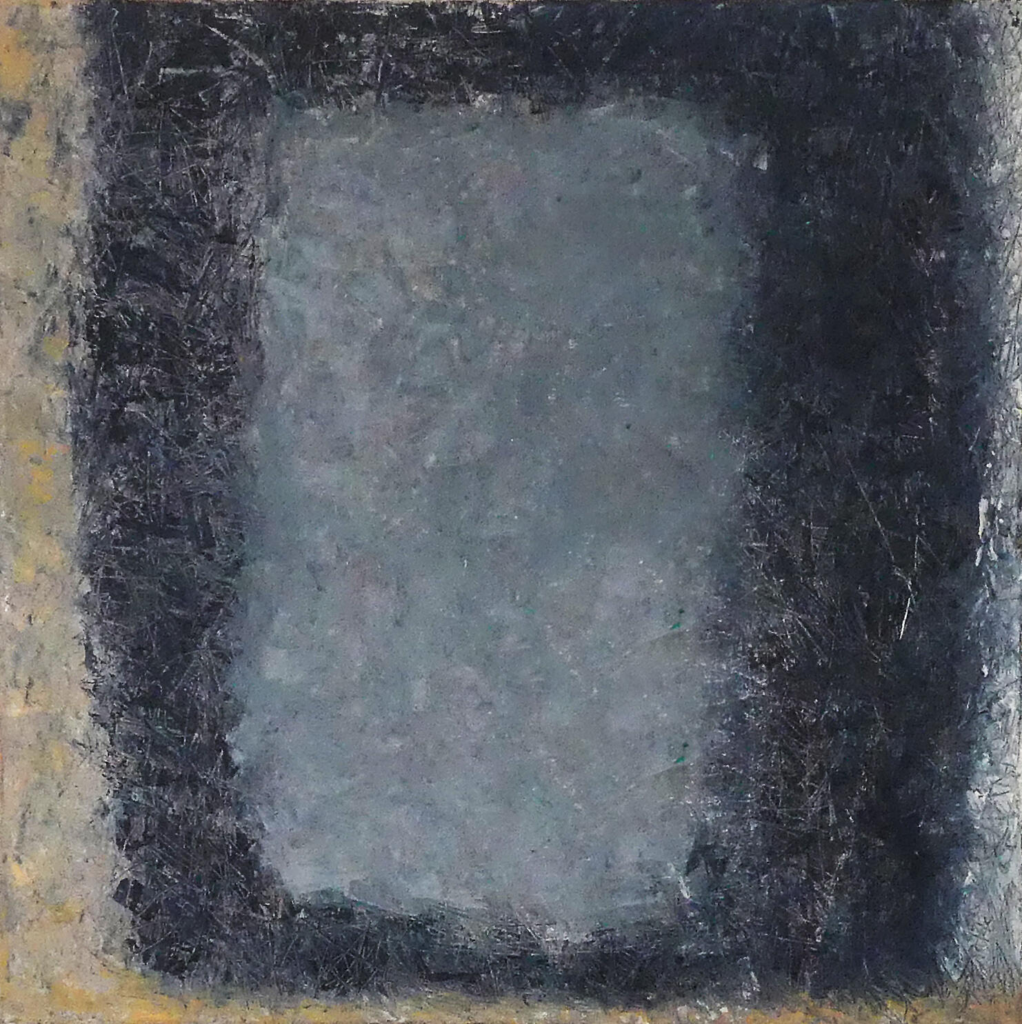 Der Farbflächenaufbau entsteht durch gleichmässigen Pinselduktus, lasierende Schichtung, ebenso wie durch gespachtelten Farbauftrag, Abkratzen, Aufreissen.